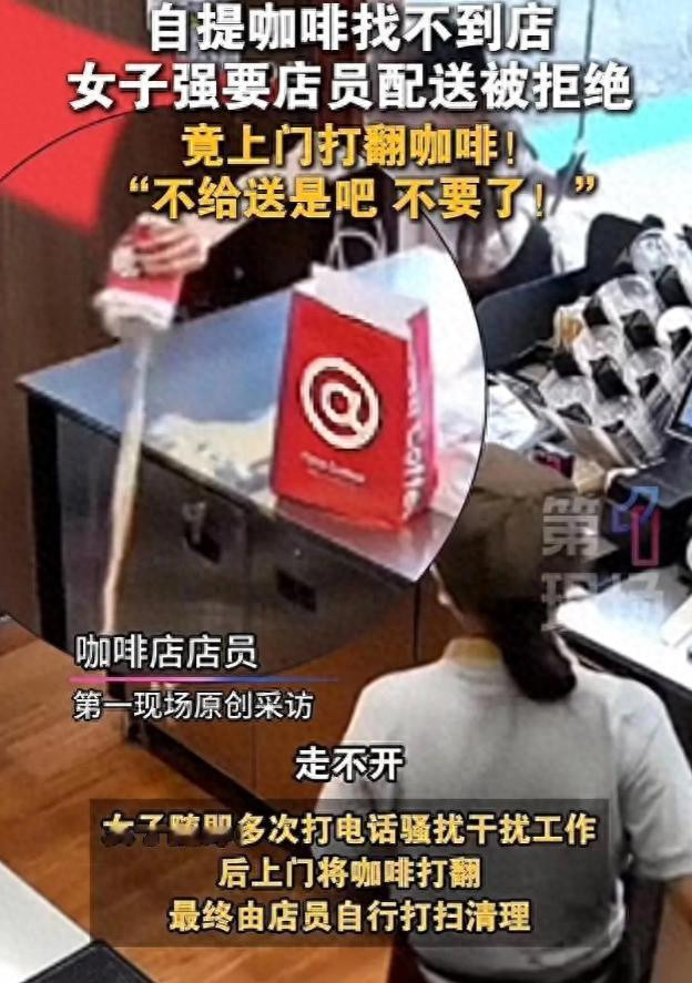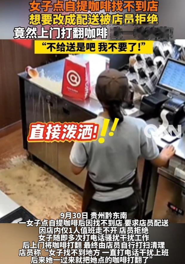 2025年9月30日,有网友在社交平台上爆出一段视频,一个女的在网上点了自提咖啡,结果找不到店,她非要让人配送,被拒后居然直接上门泼咖啡。